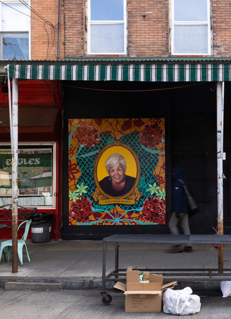 Newkirk Memorial Garden by artist Eliseo Art Silva is located in the Brewerytown neighborhood of Philadelphia, Pennsylvania. The mural is a restoration/redesign of a mural previously created at the site in 1985 by the Philadelphia Anti-Graffiti Network. The original mural functioned as part of a memorial garden. Many of the foundational elements in Silva’s current mural were derived from that initial image: a verdant landscape with a distant mountain under a plain blue sky, a narrow winding path flanked by lush vegetation, and potted plants throughout the garden.