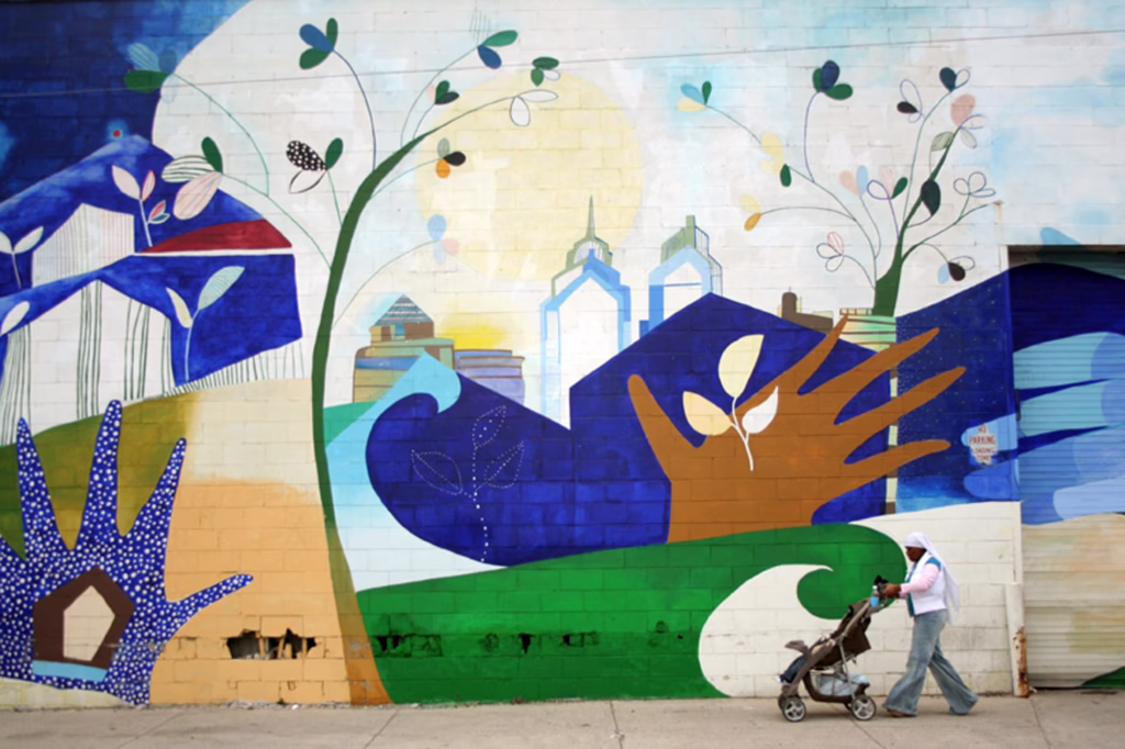 Pathfinder in the Sun by artist Josh Sarantitis is located in the University City neighborhood of Philadelphia, Pennsylvania. This mural was dedicated to commemorate the 50th anniversary of the Horizon House, a nonprofit organization dedicated to bettering the lives of people with mental disabilities and mental illness. The mural is located on the wall of the courtyard on the Horizon House headquarters. This central image of a hand is symbolic of the Horizon’s House ability to reach out and help those in need of their services. The sun has an internal maze—symbolic of people finding their way. The theme of “pathfinder” comes from a Native American legend of a finding one’s path along a journey.