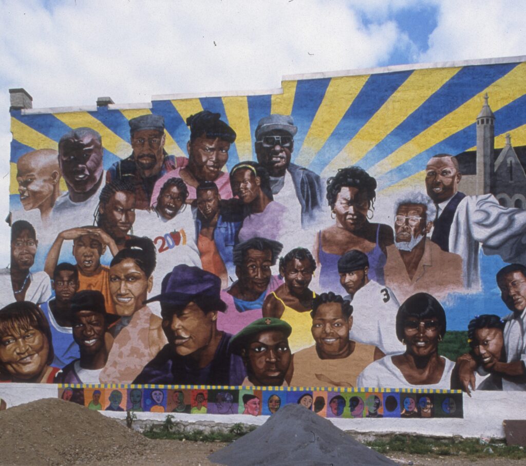The mural is rich with symbols of peace (a white lotus flower, flying origami cranes) combined with images inspired by the surrounding neighborhood. The central building depicted is Tindley Temple (750 South Broad Street), named after Charles Tindley, a popular minister and hymn writer. Other neighborhood buildings are also depicted. The children’s faces that frame the mural symbolize our most valuable asset, our future. A ghost image at the right of the mural is Marian Anderson, who grew up a few blocks away from the mural’s location. The haiku poetry printed within the mural is from Tony Morrison, Alice Walker, Sonia Sanchez, Maya Angelou, and others.