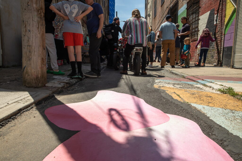 A petal procession is most often seen at a wedding or ceremony of love. Artist Lindsay Bedford created a visually exaggerated Petal Procession on the 1300 Block of South Percy Street to guide the movement of those looking to commemorate love. After connecting with a Percy Street Project neighbor and board member, the artist recognized they both shared experiences of love at Percy Street, as did many other Philadelphians. This experience inspired her to create an environment that further celebrated love and public street art in the City of Brotherly and Sisterly Love.