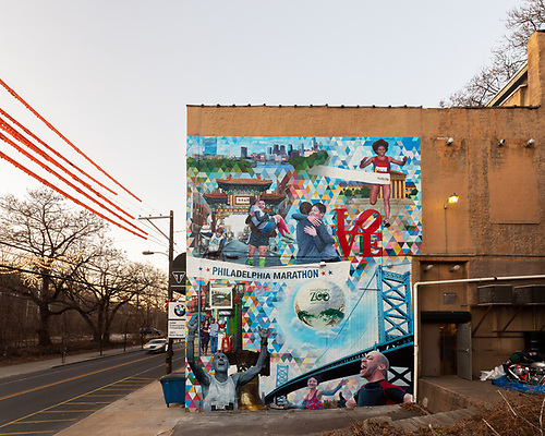Philadelphia Microcosm was part of the 125th Anniversary celebration of the Reading Terminal Market and part of a larger improvement plan of Filbert Street to make a better connection from the transportation hub to the Market. Artist Jon Laidacker was able to capture the spirit of this hub space where an overlap between the two worlds is fully intertwined and the vital connection of public transportation as it supports access to markets and commerce thrives. This microcosm of Philadelphia brings people from all walks of life together, whether local residents, visitors from afar or people just passing through during their lunch break, these new murals and additional interior painted improvements transform the entire vestibule where these two worlds come together.