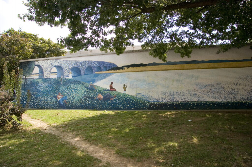The entire mural was created by the artist in her studio using large squares of a polyester fabric called non-woven media (or parachute cloth). These were then adhered to the wall with an acrylic gel, much like a giant decoupage. Saligman’s style is very painterly yet also very realistic and makes frequent allusions to classical themes and figures like the muses in this composition.