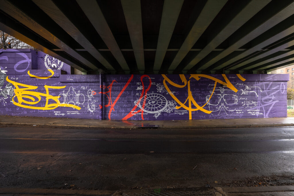 Philadelphia Pharmacy by artist Parris Stancell was located in Kensington neighborhood of Philadelphia, Pennsylvania. Painted over the top of a mural from the late 1990s, this mural was an example of Mural Arts Philadelphia’s continued commitment to the upkeep of their murals. Painted on the side of a historic pharmacy, the mural encompassed two sides of the building with Stancell’s vibrant colors, large figures and movement to sweep the eye from one wall to the next, drawing in passers by.