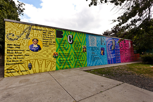 Pioneering Women A-Z pays homage to great Bryn Mawr and West Philadelphia women activists, writers, singers, abolitionists, suffragettes, and volunteers. Artist Shira Walinsky combined photo transfer and free-hand portraits presented in an “A-to-Z” format that accentuates the range of accomplishments of the women listed on the wall. Various fonts are used, alluding to the past and present. The color spectrum provides the background for text that describes the accomplishments of these many notable women. Students at Parkway West High School participated in the creation of the mural, along with students, faculty, and staff of the college during several paint days in the fall of 2010.