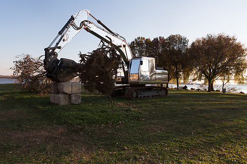 Throughout the year, RAIR (Recycled Artist in Residency) hosts visiting artists to source materials and inspiration from their studio housed within a construction and demolition recycling facility in Tacony, which sees over 450 tons of reusable waste each day. For Monument Lab, RAIR’s lead artists, Lucia Thomé and Billy Dufala, envisioned a sculpture that staged the tension between Philadelphia’s identity as a green sustainable city and the current building boom, in which the civic and often natural landscape is altered with development on a massive scale. Plainsight is 20/20 featured an excavator holding a large tree—two objects regularly found in construction sites in the city—and elevated their pairing to monumental status. The construction equipment, wrapped in metallic vinyl, was meant to stand out from and reflect the landscape, while the tree, diverted from the waste stream, was exhibited roots and all. They were presented together, behind an 8-foot-tall construction fence in Penn Treaty Park, as symbolic of the tensions between nature and progress, as well as agency and access, within the messy culture of rapid redevelopment.