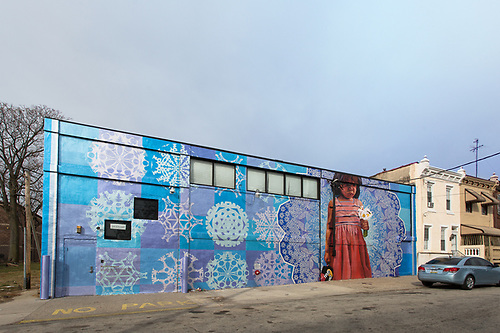 The mandala that forms the focal point in the mural is filled with images of things children might find in a garden. The snowflakes depicted in the mural are representative of individuality but also of things created in classrooms as children. As part of the project, a community paint day was scheduled where members spent several hours creating and painting their own snowflakes.