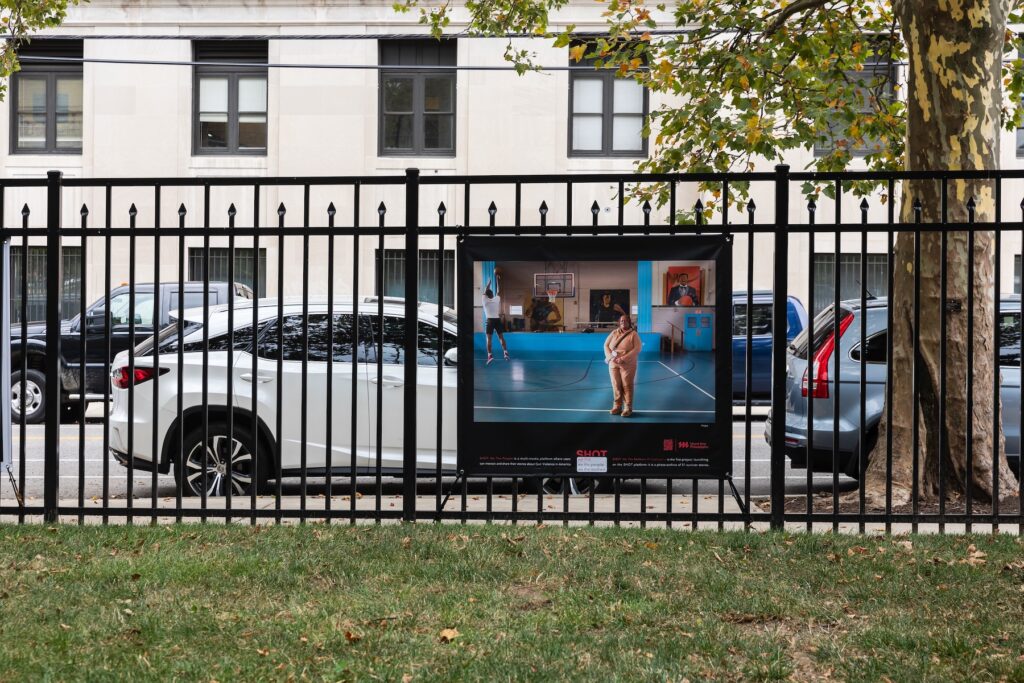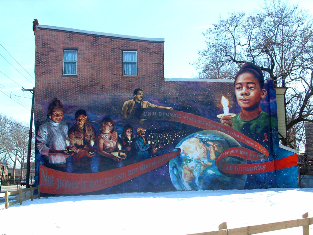 Remembrance by artist Eric Okdeh is located in the Sharswood neighborhood of Philadelphia, Pennsylvania. The first of two projects done in collaboration with the City of Philadelphia Department of Human Services, this mural remembers those who have died of HIV and AIDS, as well as those battling the illness. The phrase on the mosaic ribbon reads: “Not poverty, nor racism, nor discrimination can prevail when one of us stands in battle against HIV for the love and care of humanity.”- Rashida Abdul-Khabeer. The candlelight vigil recedes into the background where the lights fade into the stars. The sepia toned figure above was an AIDS educator and activist with Bebashi up until his untimely passing.
