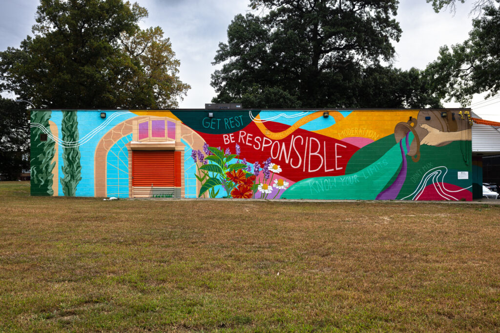 Designed through a series of community engagement activities, this vibrant mural brings to life the collective wisdom of the community, celebrating the importance of drinking responsibility and promoting a culture of respect and awareness. It is a visual representation of the conversations, rhythm, and insights shared by neighbors, friends, and family members who have come together to define what it means to be a responsible person. The mural includes flowers set against a colorful patterned background that includes messages related to responsible alcohol consumption, including: Be Responsible, Get Rest, Moderation, and Know Your Limits.
