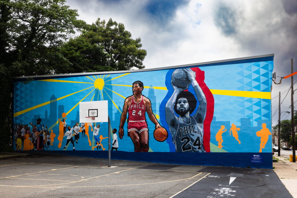 Shoot for the Stars! A Tribute to Wali “The Wonder” Jones, a mural by artists Gabe Tiberino and Taqiy Muhammad, is located in the Mantua neighborhood of Philadelphia, Pennsylvania. It honors the life and achievements of Wali “The Wonder” Jones, a member of the World Champion Philadelphia 76ers team of 1967, an All East Regional player for Villanova, MVP of the USA Senior Dream Team, beloved educator, activist, and community member. The mural introduces Philadelphia’s youth to the rigor, discipline, joy, and commitment that are critical to success, both on and off the court. Jones has partnered with We Embrace Fatherhood and The HUB Coalition, two youth development-focused organizations founded by Mantua community leaders, to lead programming both on and off the courts. The mural features a quote by Joe Walker, founder of the HUB Coalition.