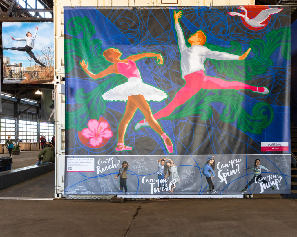 Mural Arts Philadelphia Artist David McShane’s mural Spread Wings was part of the Philadelphia Ballet’s (formerly Pennsylvania Ballet’s) exhibition inspired by Shawn Theodore’s photographs of company dancers. The portable, free-standing mural was displayed as part of Spread Your Wings , a public exhibition of photography, video, an indoor mural, and live performances created to inspire creativity and personal engagement with dance and storytelling.