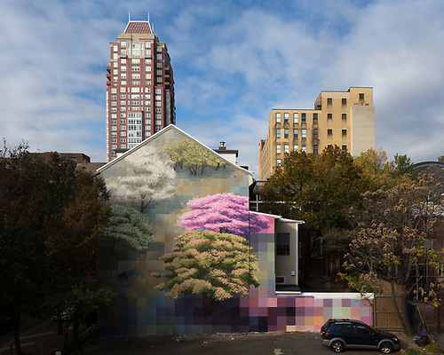 Part of his Seasons series of projects, Spring is a mural designed by David Guinn to connect the trees on either side of the wall, on Pine Street and in the backyard of the house, as if there were a park in front of the wall rather than a parking lot. The artist wanted to paint the trees crisply and in detail but, at the same time, have a soft and organic feel. He was inspired by the idea of making soft forms out of discreet, hard-edged blocks of color. His hope for the squares was that they would allow the mural to be seen simultaneously as a flat abstraction of color and as having depth and space.