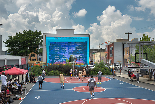 Stories of the Square by artist Henry Bermudez is located in the Norris Square neighborhood of Philadelphia, Pennsylvania. The symbolism in the mural is thought-provoking and full of hope and emotions of people who created it. The youth and senior citizens of the community unite around a tree in their park. The larger birds in the tree represent the older members of the community, while the small birds symbolize the children; both generations listening to the other and learning from each other. The bottom of the mural includes various pieces of artwork created throughout the workshop sessions. Each piece represents a view of the participant who created it of something positive and something challenging in their neighborhood. Additionally, skulls are painted at the roots of the trees; an idea developed by a participating teenager who shared that the community should not ignore the ugliness in the community, but try to overcome it. The colors intensify in the upper-half of the mural, where a colorful sunset is emphasized. This is the contribution of a youth who shared that it is one of the beautiful things she can count on seeing everyday in her neighborhood.