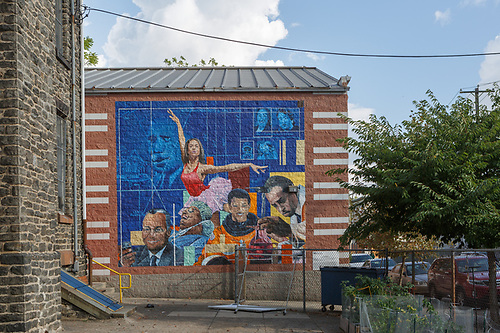 Depicted in the mural are: (blueprint, left to right) historic Wissahickon Boys & Girls Club, William Coleman; (upper right) Margaret Roselle Hawkins and Sarah Strickland Scott, Founders of The Links, Inc.; (lower right) Charles Shirley and M. Francis Hunter, esteemed Wissahickon Boys & Girls Club Alumni. STEAM innovators (in color, left to right) include: Henry T. Sampson, Engineer and Technologist; Dr. Alexa Canady, Neurosurgeon; Misty Copeland, Ballerina; Mae C. Jemison, Astronaut and Doctor; and Percy Julian, Chemist and Civil Rights Activist.