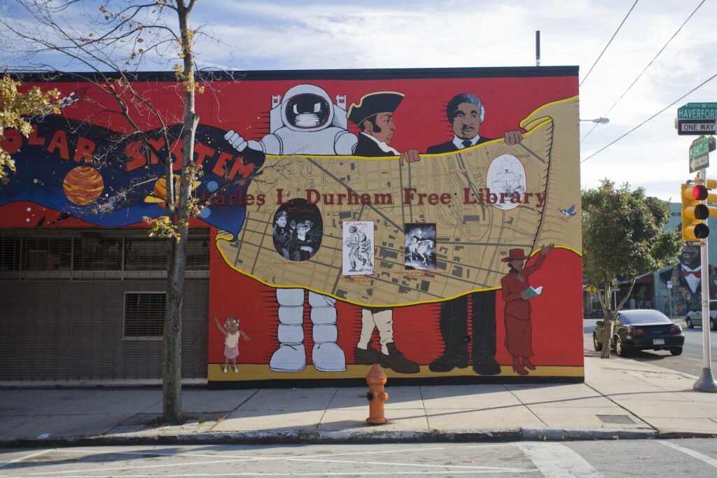 This project provided ample opportunity for this eam of artists to work together to create a truly amazing visual transformation. The William Cullen Bryant School, located at 60th and Cedar Streets in West Philadelphia, is one of the oldest school buildings in the district, dating back to the early 1900’s. Over the years it had seen the addition of a new wing that provided a cafetorium and library (the architecture of which is rather quirky and clashes visually with the older parts of the building). It has also seen countless hits of graffiti tags that had been painted over multiple times, making the exterior of the building a patchwork of mismatching reddish-brown anti-graffiti paint. There was also a very large school yard with no playground equipment. But this project transformed this space into a colorful mural-filled learning environment with a large play structure, a 50’ x 50’ field of padded astroturf, and a quiet, shaded patio with benches and tables (with built-in chessboards).