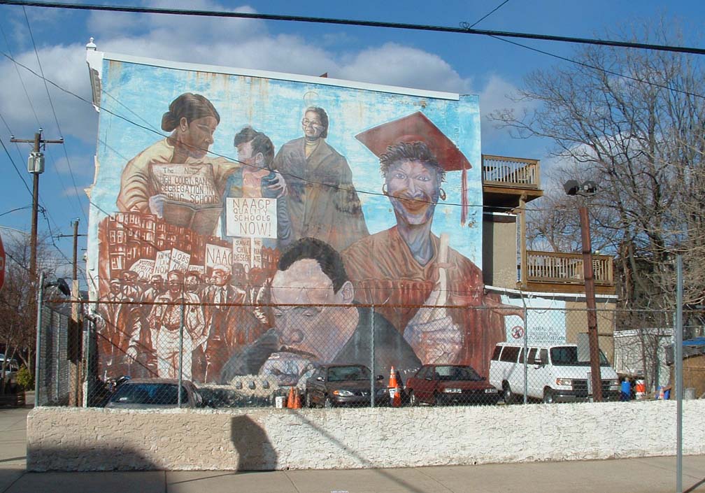 The Civil Rights Mural by artist Benita Ambrose was located across from a church in Philadelphia’s Point Breeze neighborhood where Dr. Martin Luther King, Jr. once spoke. It was created by the Philadelphia Anti-Graffiti Network, precursor to the City of Philadelphia Mural Arts Program.