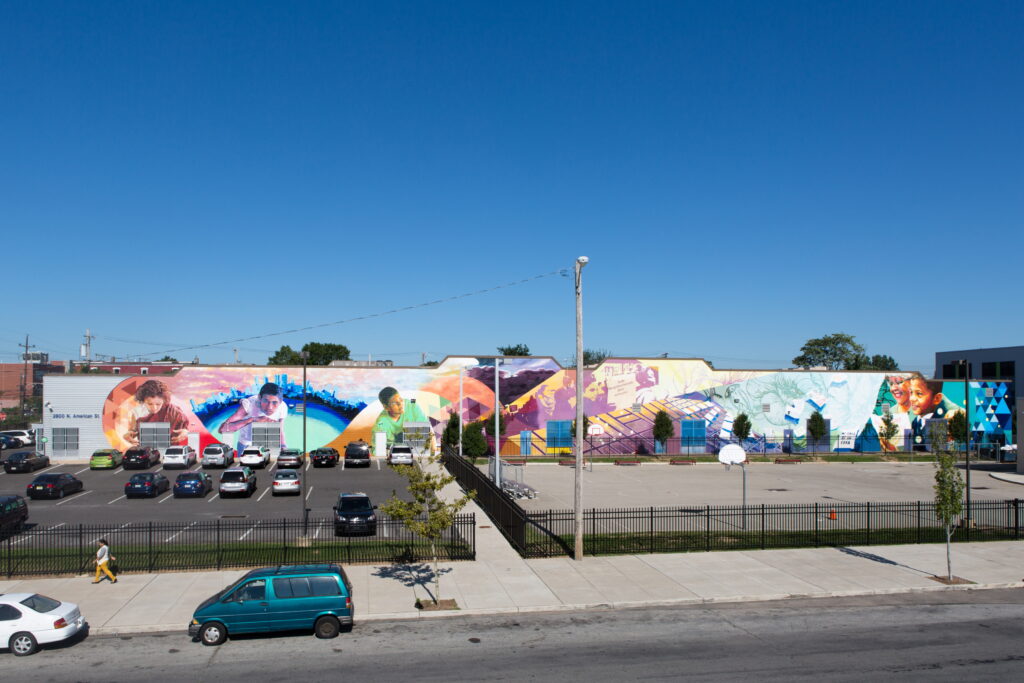 The Doors of Destiny by artist Michelle Angela Ortiz is located in the Fairhill neighborhood of Philadelphia, Pennsylvania. Extending The Doors of Destiny are in Your Hands, a mural completed in 2004 on the facade of Congreso de Latinos Unidos, Ortiz worked with students at Kensington CAPA and Edison/Fareira High School to create an new project called Doors of Destiny. This project focuses on maintaining a positive outlook in the face of adversity and conflict. Ortiz led conversations and workshops with students focusing on eliciting the positive components of the problems we face. Many students participating in the project are forced to navigate neighborhood drug trafficking on their way to and from school. This problem, combined with the other issues plaguing low-income communities, and the recent nationwide awareness of police brutality in communities of color creates a climate difficult for young people to learn and grow. Through intentional conversations, mindfulness workshops,and art-making, Ortiz channeled students’ concerns into the mural. She had the youth concentrate on what they celebrate in their lives rather than what adversely affects them. This shift in thinking has allowed students to better understand the complexities of life and how to have agency in the choices they make. The mural also celebrates Congreso’s longstanding presence in North Philadelphia as haven, and a place to learn and grow.