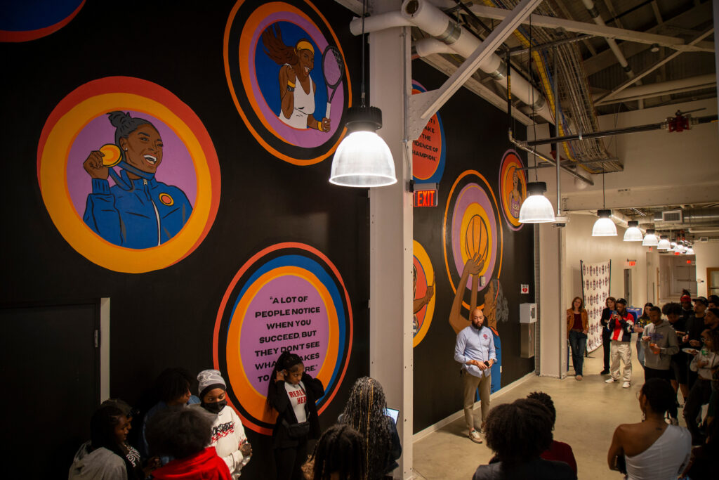 The Game is Yours is an interior mural commissioned by Philadelphia Youth Basketball for their their Sixth Man Center facility in the Nicetown neighborhood of Philadelphia, Pennsylvania. The mural celebrates female empoweerment. Artist Dyymond Whipper Young led two highly interactive and successful workshops with young female students who talked about quotes they found inspiring and black female athletes that they look up to. Dyymond took these concepts, and borrowed colors from the court across the way from the wall where her mural was to be located, and created a beautiful and eye-popping design that jumps off the wall. The students were elated to see their vision come to life and spoke about how they see themselves in the faces depicted in the mural.