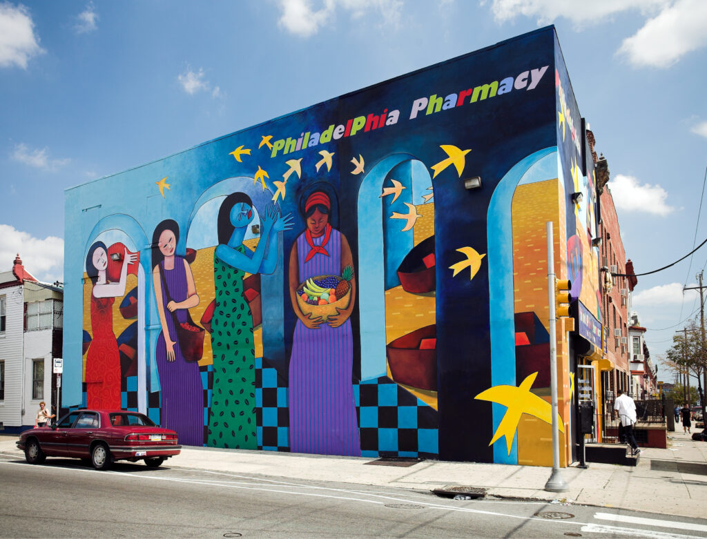The Lady from South Philadelphia by artist Nicholas Conrad Miller is located in interior of the Marian Anderson Recreation Center in the Southwest City Center neighborhood of Philadelphia, Pennsylvania. The mural pays tribute to Marian Anderson, the famed African American contralto opera singer and one of the most celebrated singers of the twentieth century. The mural depicts Anderson in a variety of poses against an opera house backdrop and wearing a variety of dresses. A central panel with a flower commemorates Anderson’s performance at the Lincoln Memorial on April 9, 1939. Miller created the mural in collaboration with the Marian Anderson Recreation Center and The Marian Anderson Historical Society.
