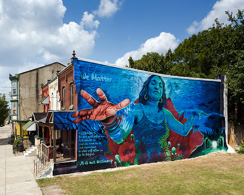The Only Way Out Is Through is the culmination of several months of workshops at Kirkbride, co-led by Okdeh and social worker Harini Reddy. Together, the artist and participants developed a design that humanizes the struggle of people dealing with addiction, and shines a light on underlying traumas with an additional quote: “We matter. We shouldn’t let our past define us, nor should we shut the door on it. Our experience is what allows us to be helpful, it is our testimony.” The person in the artwork is shown under layers of water and pattern, with one hand emerging in full color to evoke a moment of clarity.