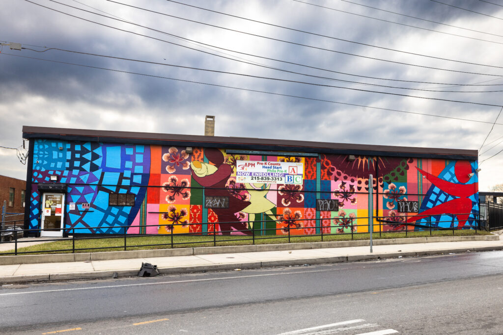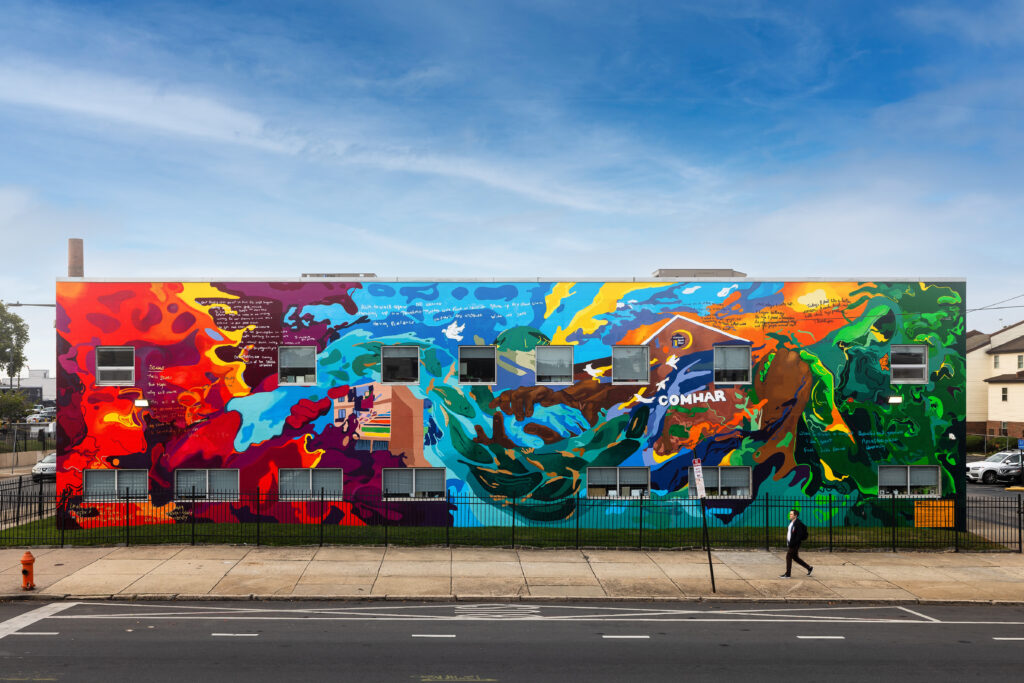 “This design culminated from ideas, theory and concepts documented during 4 months of workshops with COMHAR members, ranging from 2-18 attendees per session. To combine my experience and traditional training in Chicanx muralism and many participants holding nature and unity to a high importance in their recovery, the four elements separated by expressive hands, represent the journey to recovery with participant poetry, tiles to depict the bad with the good. Smaller narratives and intentions of the mural design include de-stigmatization, connection, amplifying voices, and the importance of collectivity. With many participants’ experience centering gratitude to community presences as well, the mural design pays homage to key community landmarks like McPherson Square / Needle Park, where librarians have trained themselves in administering Naloxone; St Francis Inn, where food, clothing, and other resources re distributed; My Neighborhood Project, providing access to community gardens; and COMHAR, where outpatient programming is held in a dayhab format. With a community feedback meeting held with the participants, many advocated for color, more hands, agreed that animals were valid representations of healthy community, and contributed their landmarks of choice. Symbolism within the animals includes Carp, a native Schuylkill River fish that swim upstream in brackish water; doves to represent the faith of many member; and flames and a feeling of underwater/drowning were participant contributions as well.”