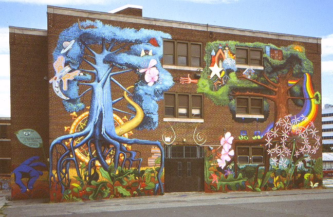 The mural depicts William Penn painted to scale as homage to the sculpture atop City Hall, set around a labyrinth of arched openings. Originally painted in 1983 by Richard Haas, it was restored by the Mural Arts Program in 2012.