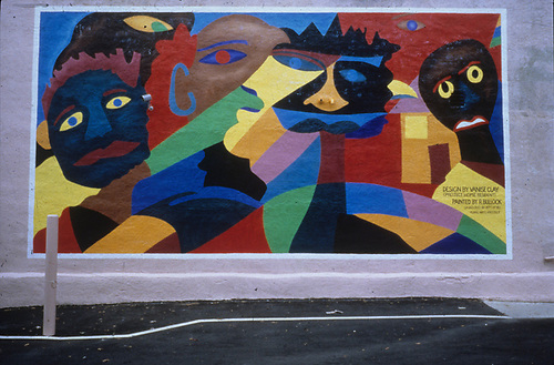 Project HOME selected a drawing by a resident, Vanise Clay, to be the subject of the mural. Robert Bullock worked from Clay’s original drawing which was drawn with markers. Clay said she wanted the picture to have a feeling of peacefulness. The faces are “watching over and taking care of what they see,” thus the title, “The Watchers.”