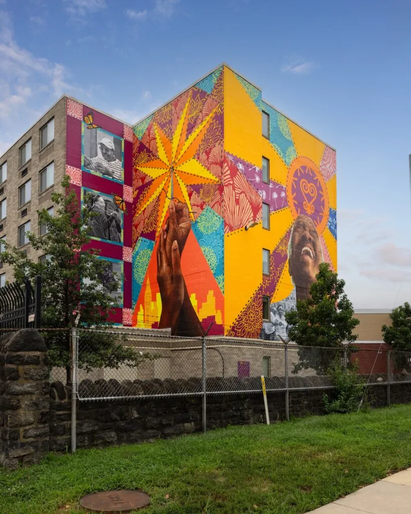 “Wall one features an elderly woman bursting with vibrancy and life, challenging ageist stereotypes. Colorful patterns stitched around her mimic the sun’s rays. She looks joyfully up at the Sankofa heart symbolizing the importance of learning from the past to build a better future. The scene on her shirt celebrates Philadelphia’s iconic block parties, fostering community across generations.