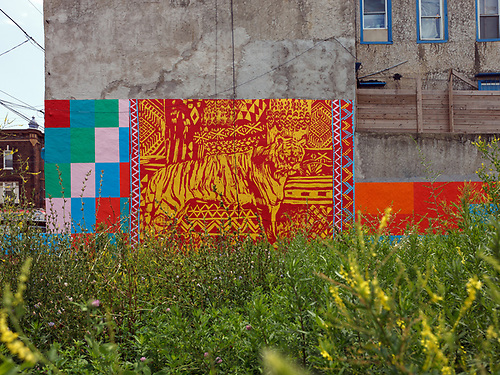 Tiger is one of a series of murals from Shira Walinsky and Miriam Singer on 7th and Emily Streets in South Philadelphia that came out of a project celebrating the diversity and resilience of new immigrants from all over the world, focusing on South Philly’s growing Bhutanese and Burmese communities. The mural and wheatpaste designs were inspired by the textiles and stories of the refugee communities, and include woodblock prints of collages made by community members. The project is a result of a partnership between the City of Philadelphia Mural Arts Program, the Department of Behavioral Health and Intellectual disability Services, and the Philadelphia Refugee Mental Health Collaborative. Read more about some of the refugee population in Southeast Philadelphia in the Mural Arts book My Future Starts Here.