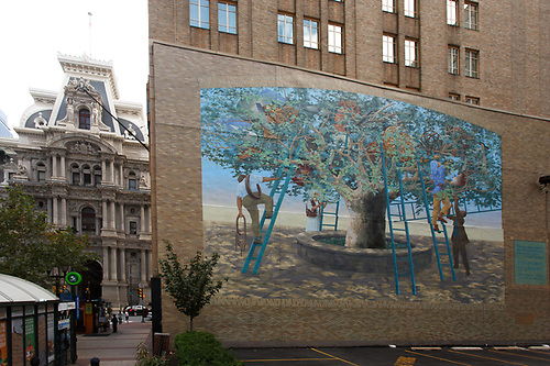 A large wall mural honoring Eisenhower Fellowships’ 50 years was formally dedicated on October 2, 2003 in Philadelphia. The mural depicts a learning tree or Tree of Knowledge and hidden among the leaves are, in artist Michael Webb’s words, “objects alluding to the breadth of human endeavor, knowledge, and perseverance.”