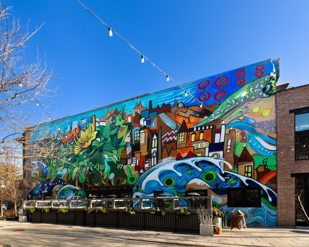 Tree Top Tulip by Paul Santoleri is the completion of a two-walled mural at the Roxborough Pocket Park. The work depicts the flower of the giant tulip tree towering over the village of Roxborough with details of the radio towers, a locally-known landmark, and neighborhood architecture. A small bird on the entry wall from the parking lot welcomes visitors to the park. As Santoleri explains: “The bird also acts as a reminder that we are living with and inside nature and that we are indeed inextricably a part of it.”