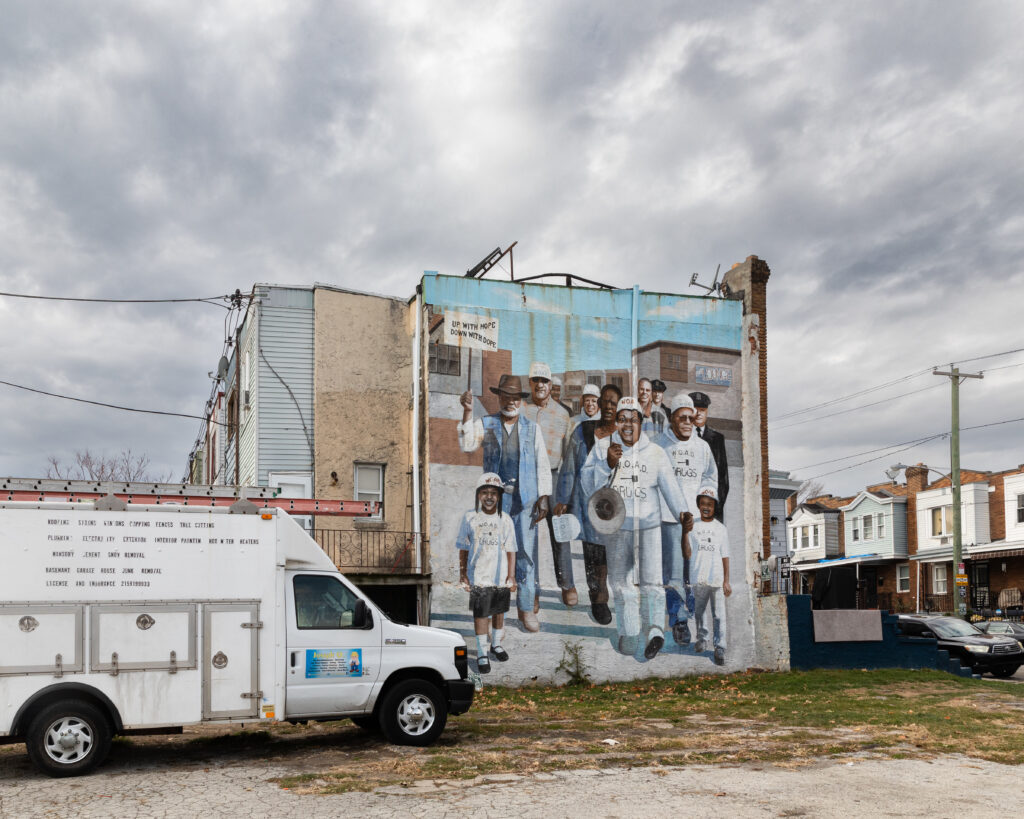 Tribute to Jacqui Campbell and WOAD (West Oak Lane Against Drugs) by artist Karl Yoder is located in the West Oak Lane neighborhood of Philadelphia, Pennsylvania. This mural is a tribute to the late Jacqui Cambell, founder of the West Oak Lane Avenue Against Drugs (W.O.A.D.). W.O.A.D. was fundamental in closing a number of drug houses and clearing drug corners. Ms. Campbell is pictured with her trademark bullhorn, which she traditionally used during the night anti-drug vigils she organized. The mural was based on a Philadelphia Inquire photograph of her during an anti-drug vigil. Her husband, Edward Cambell, who continues the work his late wife, organized the mural project. The mural also depicts two police officers shot in the line of duty in 1995 and 1996.
