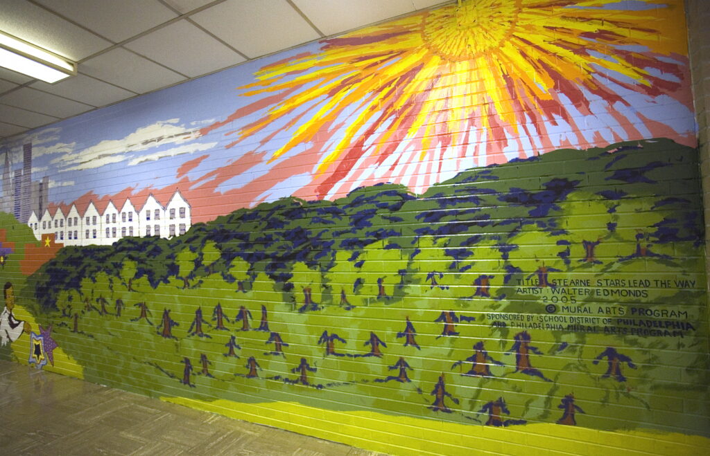 Both murals are on the Broad Street façade of the Philadelphia Police District 35 building, flanking the main entrance. Artist McShane thinks of them as essentially as one mural.