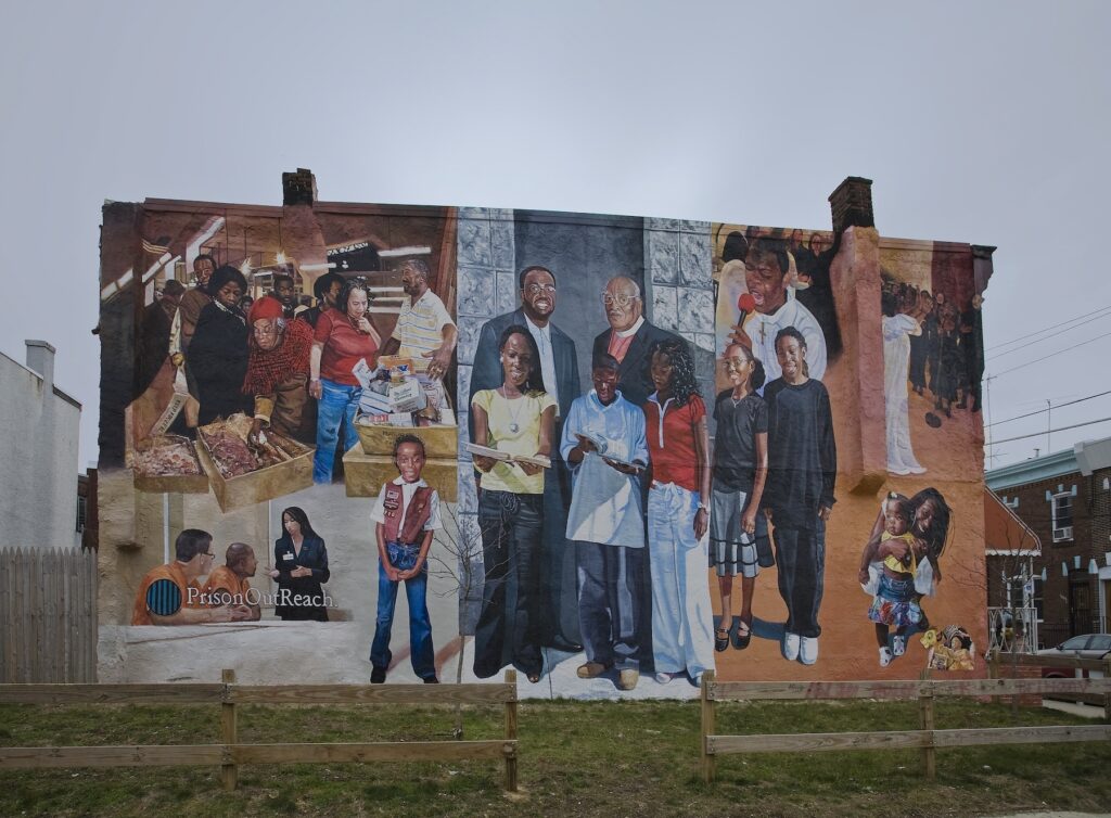Tribute to the Italian-Americans of Tacony by artist Karl Yoder is located in the Tacony neighborhood of Philadelphia, Pennsylvania. A tribute to the many Italians who immigrated to the US in the early part of the 20th Century and particularly in the Tacony section of Northeast Philadelphia, this mural features the faces of men, women, and children who make up a portion of this community. Standing in front of a church and a municipal building under an Italian and US flag, this mural emphasizes that the Italian American community has a presence in the wellbeing of the community at personal, political, and spiritual levels.
