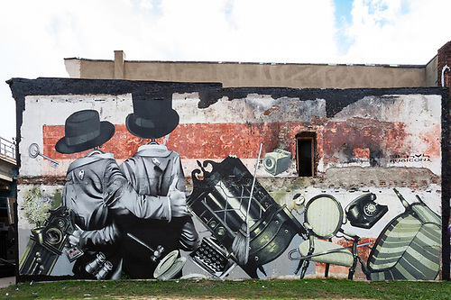 Location Note: Mural no longer on view at this location (obscured by a fence and partially painted out as of 2019).