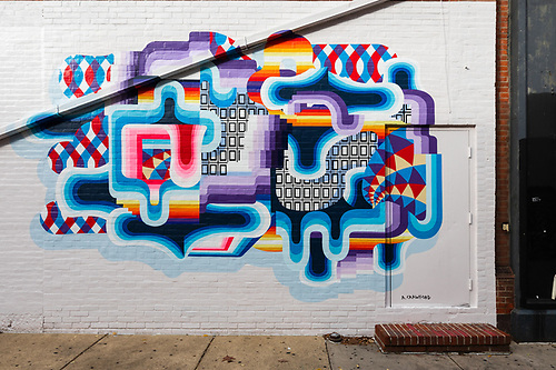 Artist Adam Crawford’s goal was to create a unique, engaging mural with strong visual appeal. He says about his work: “I enjoy using the representation of technology paired with human or organic shapes. The contrast between these two ideas creates an interesting commentary about the landscape we currently live in, while also achieving my primary visual goals.”