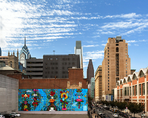 A new mural from artists Eurhi Jones and David McShane celebrates the connection between Philadelphia’s rivers and local flora, and between the Philadelphia Water Department and the Pennsylvania Horticultural Society. Water Gives Life reimagines the 1998 mural painted by McShane in the same location, building on a history of work with PHS to open up discussions of sustainability and the urban landscape. Inspired by Japanese–American sculptor Ruth Asawa’s hanging wire sculptures, the design features botanical arrangements suspended above an aerial view of the city, showing the complex network of pipes that deliver clean water from the Schuylkill to the Delaware.