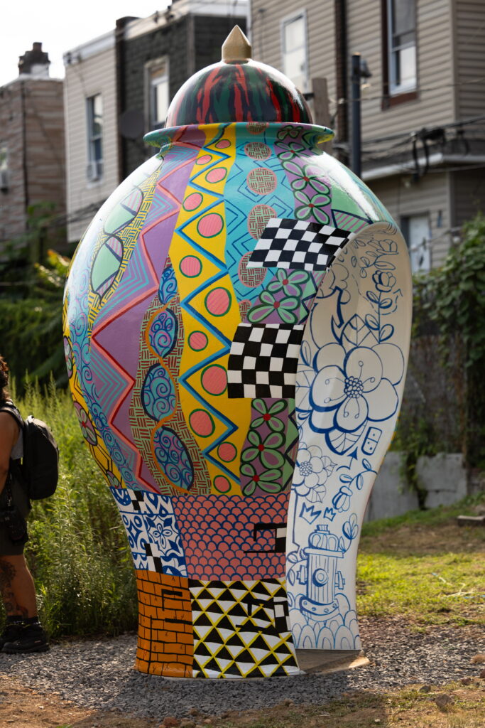 We Here offered an immersive artistic journey with workshops and public programs throughout the project. During Fall 2023, a series of community workshops in Kensington generated dozens of unique pattern designs, which artist Robert Lugo has since incorporated into three monumental outdoor sculptures. Each twelve-foot vessel, installed at sites across Kensington in summer 2024, stands as a testament to the neighborhood’s rich cultural tapestry and features a cutout entryway that allows visitors to step inside and see themselves in the artwork. Lugo’s unique blend of classical ceramics and urban culture invites the Kensington community to see art as a mirror of their collective creativity, identity and strength.