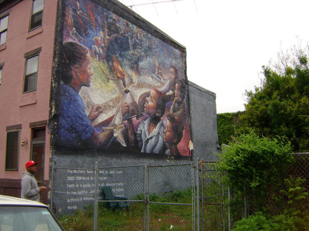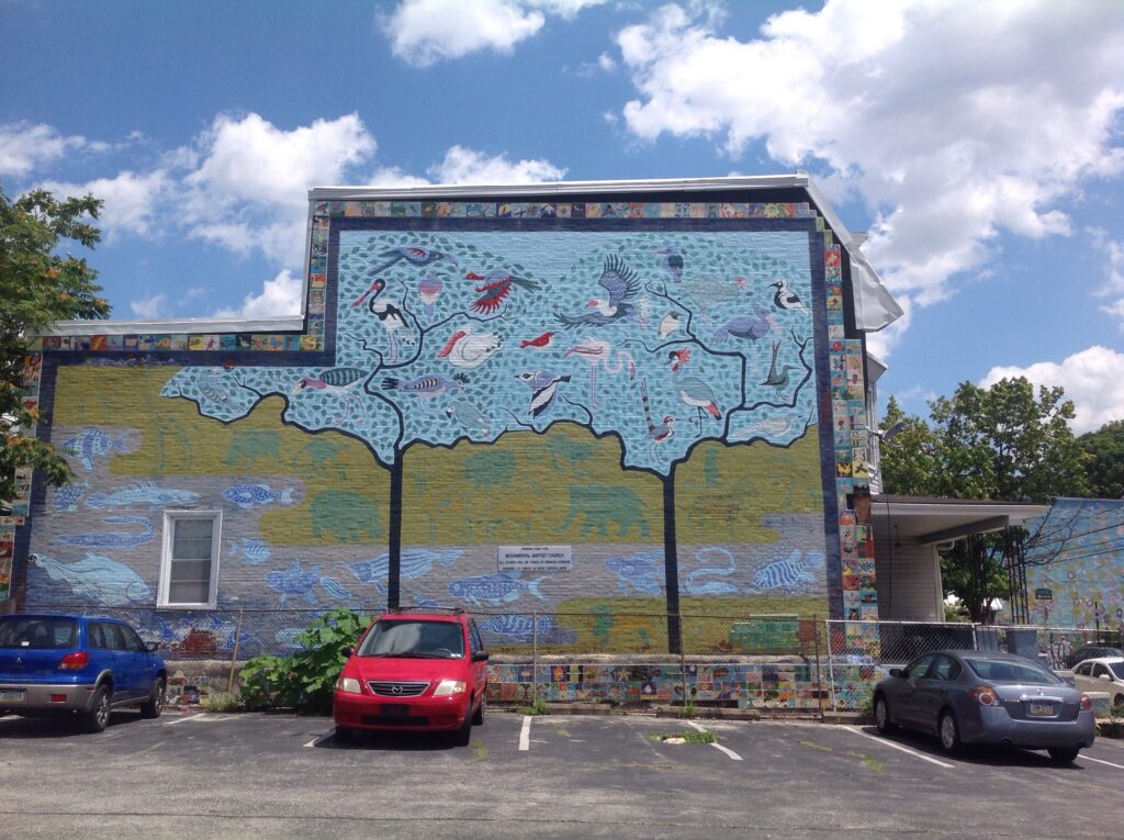 Wild Life of the African Continent by artist Eurhi Jones is located in the Walnut Hill neighborhood of Philadelphia, Pennsylvania. This mural was painted in conjunction with the Philadelphia Museum of Art after school program. 180 children created the 1000 tiles that accompany the mural on the wall. The artist originally suggested a theme of fish and birds for the children to work with. The building’s owner suggested and African theme so the final sketch was modified to include animals easily recognizable as African. Jones was happy with the final composition because she now feels the mural has more meaning to the surrounding neighborhood. Included in the mural are 22 different species of birds, 14 mammals, and 22 kinds of fish.