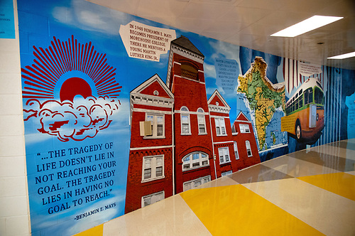 The idea for Words Behind the Movement began with quotes from Martin Luther King, Jr. and Benjamin E. Mays. From these quotes, their connection as leaders was illustrated along with other images that portray the Civil Rights Movement. The timeline begins on the left of the mural with an image of Graves Hall, a building of Morehouse College, where Benjamin E. Mays was president. This is also where Martin Luther King. Jr. attended college. Continuing on the timeline is a map of India, representing a trip Martin Luther King, Jr. took to learn about nonviolence from the teachings of Gandhi. Next is the image of the bus that Rosa Parks was on when she was arrested. Behind the bus is the cropped police photograph of Martin Luther King, Jr. when he was arrested in Birmingham, Alabama after violent protests there. Following this there are pairs of legs marching on Washington. Underneath are strips of text from the “I Have A Dream” speech. This speech is visually represented as steps of progress for the marchers. The large microphones symbolize the wide reach of Martin Luther King, Jr.’s words and their importance. The mural ends with the image of the steps of the Lincoln Memorial where he delivered his famous speech.