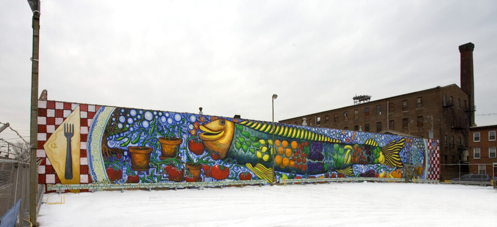 The location of this mural was chosen because diabetes diagnoses in people aged birth to 18 was the highest in the city. In response to Fishtown Neighbors strong sense of pride, the artist fashioned a fish out of fruits and vegetables to show the influence that good nutrition/healthy eating habits can have on diabetes prevention.