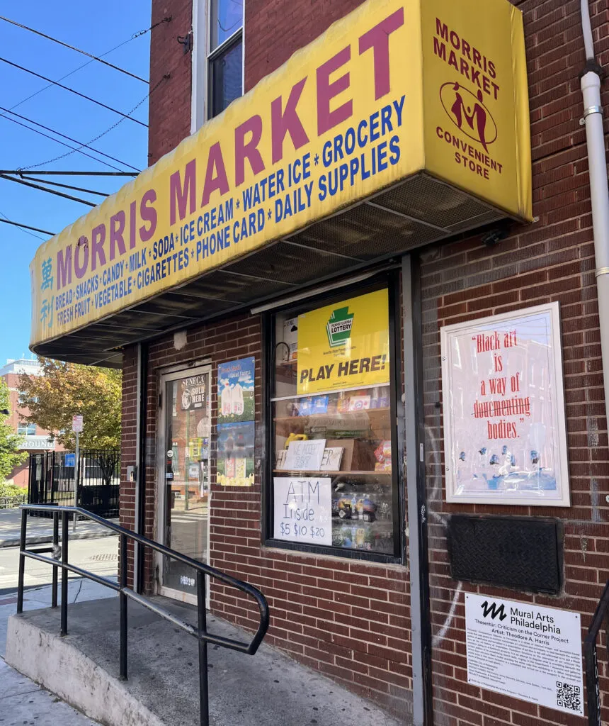 Thesentür: Criticism on the Corner by artist Theodore A. Harris is a series of minimalist image- and quote-based works that use poetry to confront mainstream art criticism and art history. It aims to look beyond the surface politics of aesthetics and formalism to present art that is not self-referential or to highlight the Black experience in the art history of imperialism. Usually exhibited in contemporary art galleries and museums, these pieces are transformed into public art for this project, engaging anyone passing by, waiting for the 29 bus, or entering the corner store. At first glance, it might look like an ad for Dutchmaster Cigars because of the font and the figures from Rembrandt van Rijn’s painting “The Sampling Officials of the Amsterdam Drapers Guild” (1616), which is actually used on the cigars. But upon closer look, this format serves as a vehicle for a broader discussion on art and art criticism, created to raise questions or make statements that Dutchmen of the era would never have expressed. The project invites the public into a poetic artspeak conversation about the role of art in our lives, emphasizing our daily experiences and how art connects to our local history—especially on that corner. The twelve-week installation features prints in the advertising space, which change every one to two weeks.