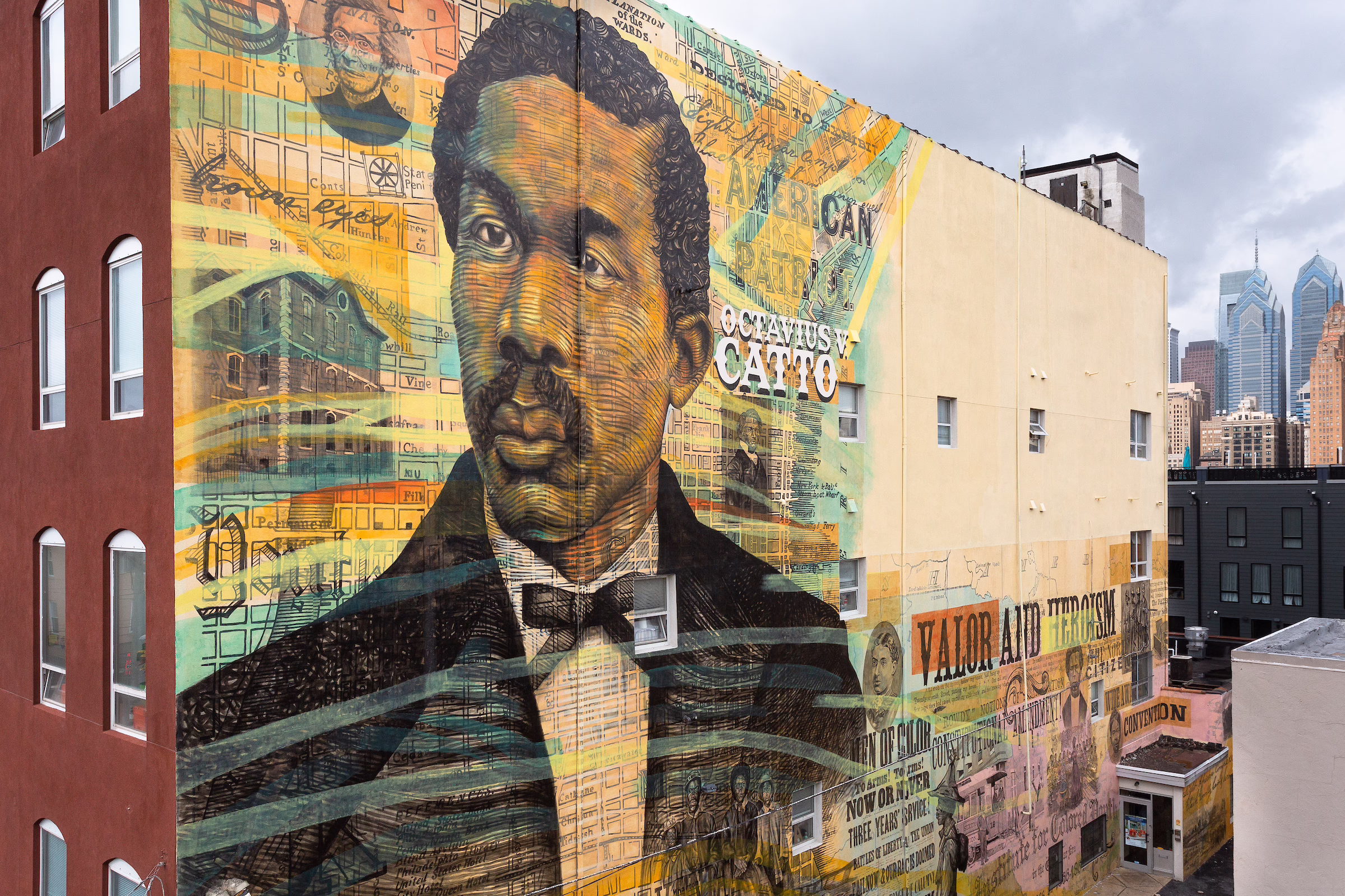 Remembering a Forgotten Hero © 2018 City of Philadelphia Mural Arts Program / Willis Nomo Humphrey / Keir Johnston, Universal Charter School, 801 South 15th Street. Photo by Steve Weinik
