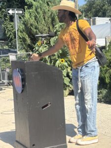Our first two workshops, which aimed to build relationships and share stories, were a great success. A significant part of my work involves narrative storytelling and taking the time to learn about ourselves, love ourselves, our history, and our future. Besides joining the cohort a little later, one of the challenges I faced was language barriers among community members. I had to adjust my original lesson plan and goal for the community workshops, as everything would be translated into three languages. It pushed me to think about what I wanted to say and how I could make the workshops impactful in the same way I usually do – but without talking as much. After leading a breathing exercise, I provided three brief prompts encouraging community members to simply create. I shared some work examples from my Assistant LoAn and, as a group, we let the art and music take over the garden for the evening.