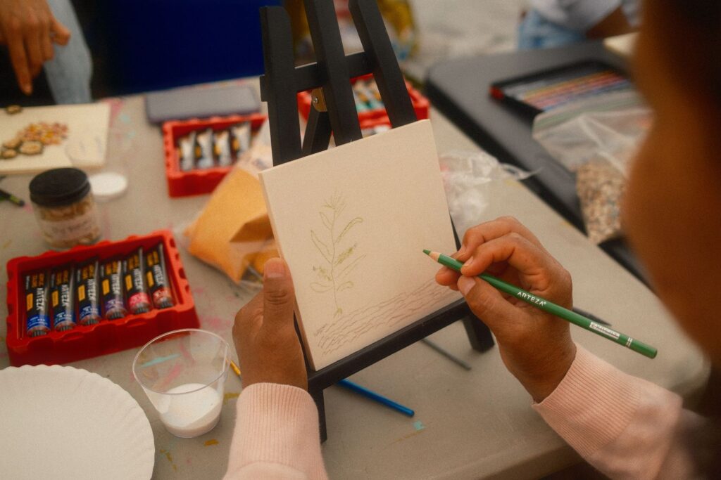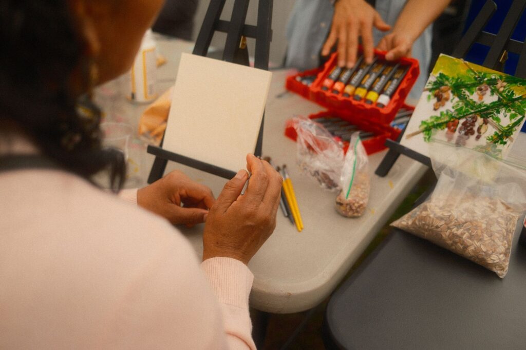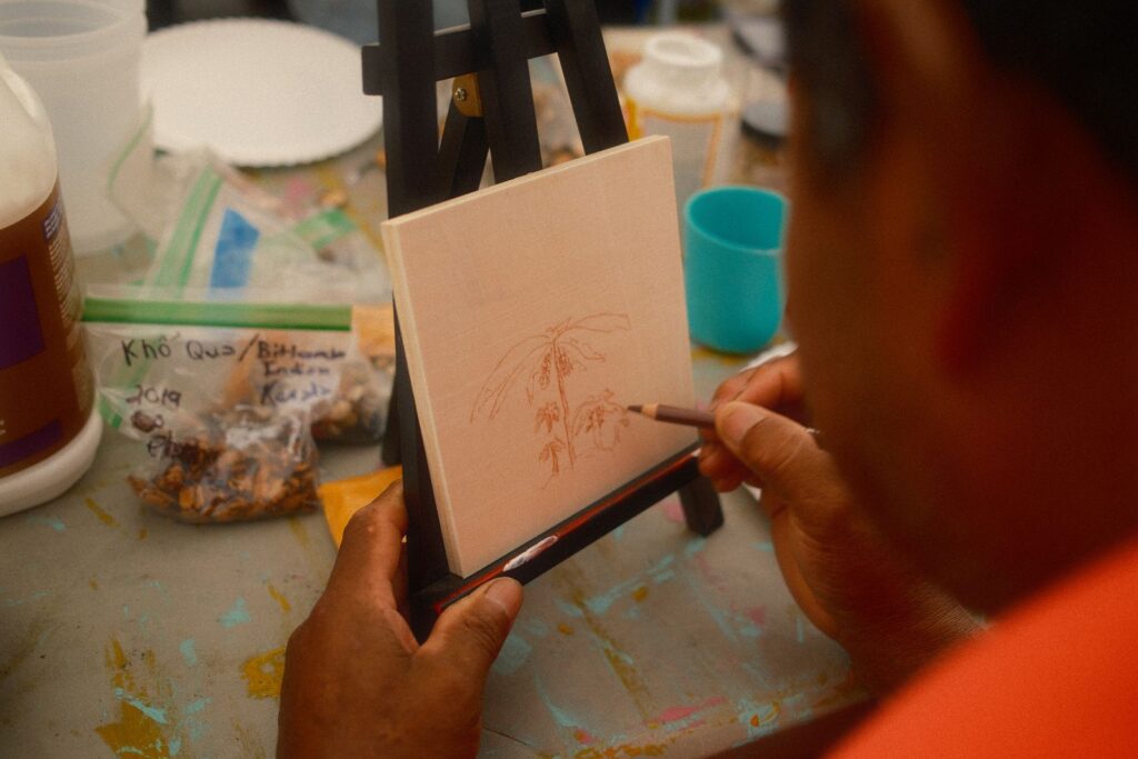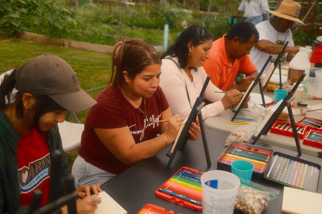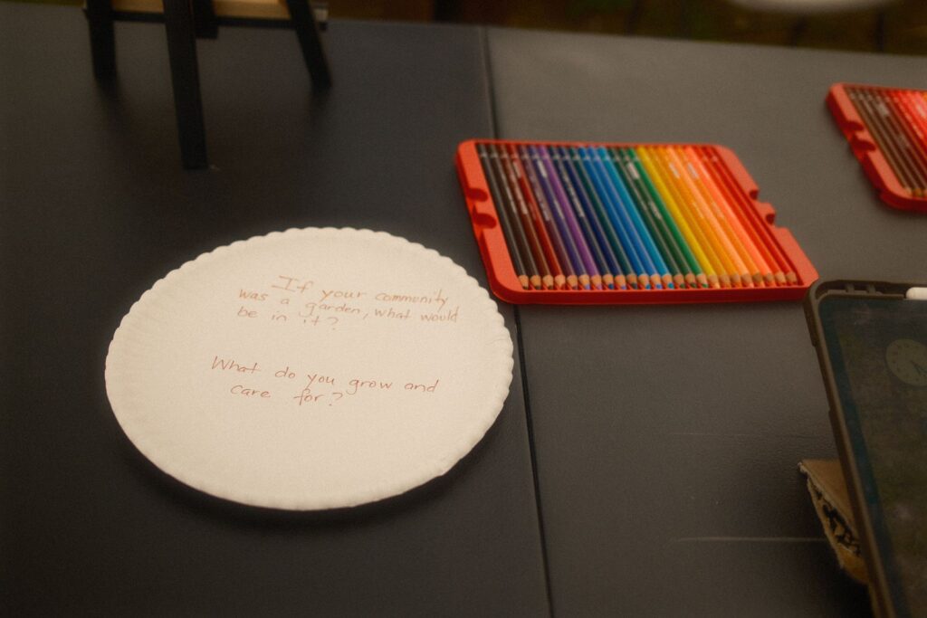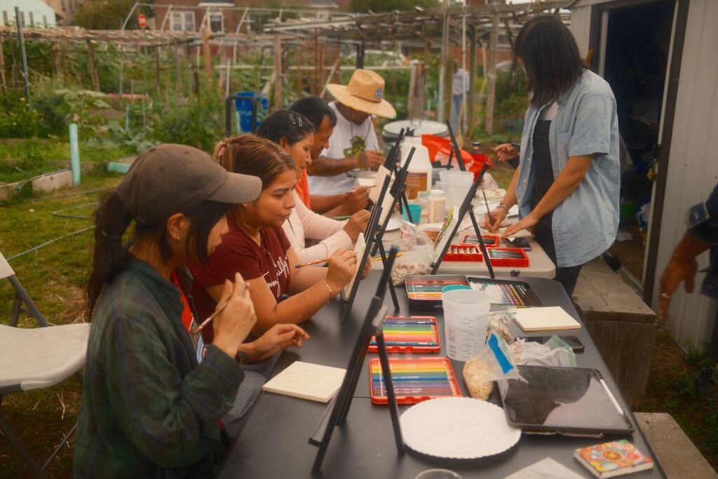 Our first two workshops, which aimed to build relationships and share stories, were a great success. A significant part of my work involves narrative storytelling and taking the time to learn about ourselves, love ourselves, our history, and our future. Besides joining the cohort a little later, one of the challenges I faced was language barriers among community members. I had to adjust my original lesson plan and goal for the community workshops, as everything would be translated into three languages. It pushed me to think about what I wanted to say and how I could make the workshops impactful in the same way I usually do – but without talking as much. After leading a breathing exercise, I provided three brief prompts encouraging community members to simply create. I shared some work examples from my Assistant LoAn and, as a group, we let the art and music take over the garden for the evening.