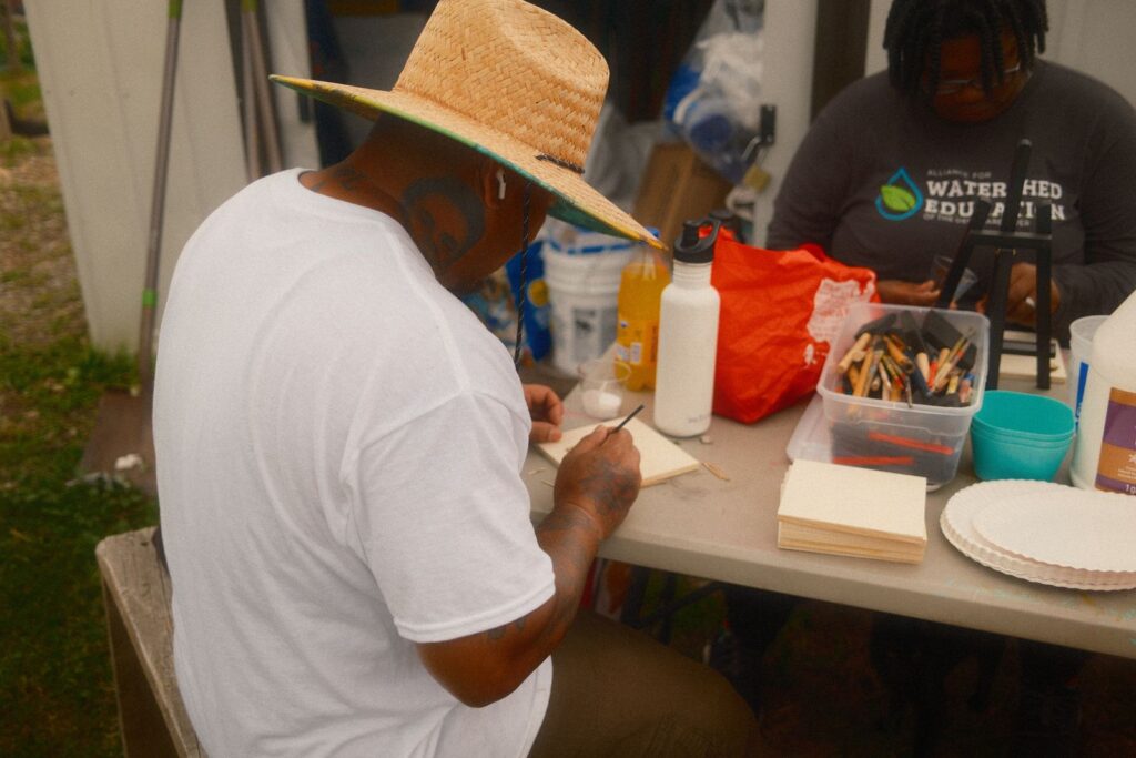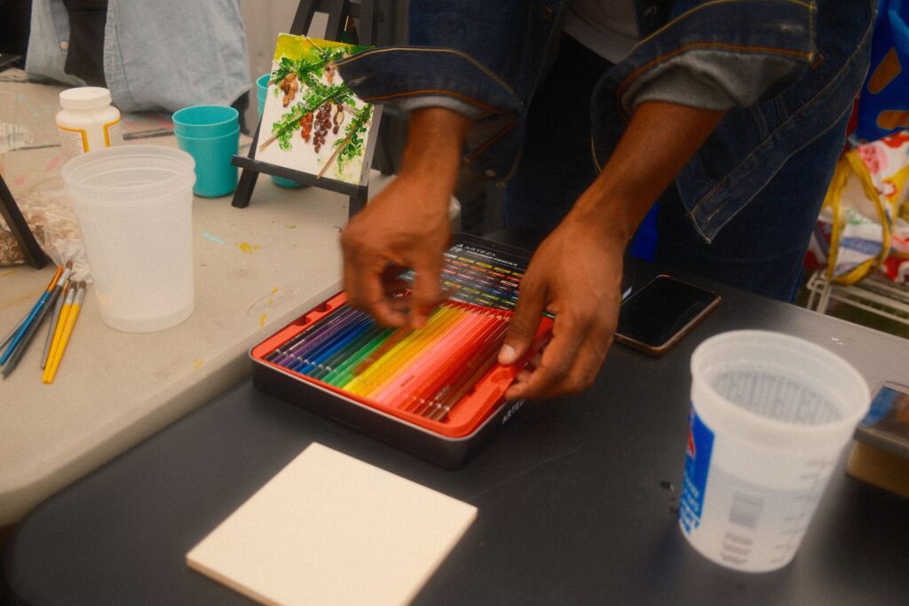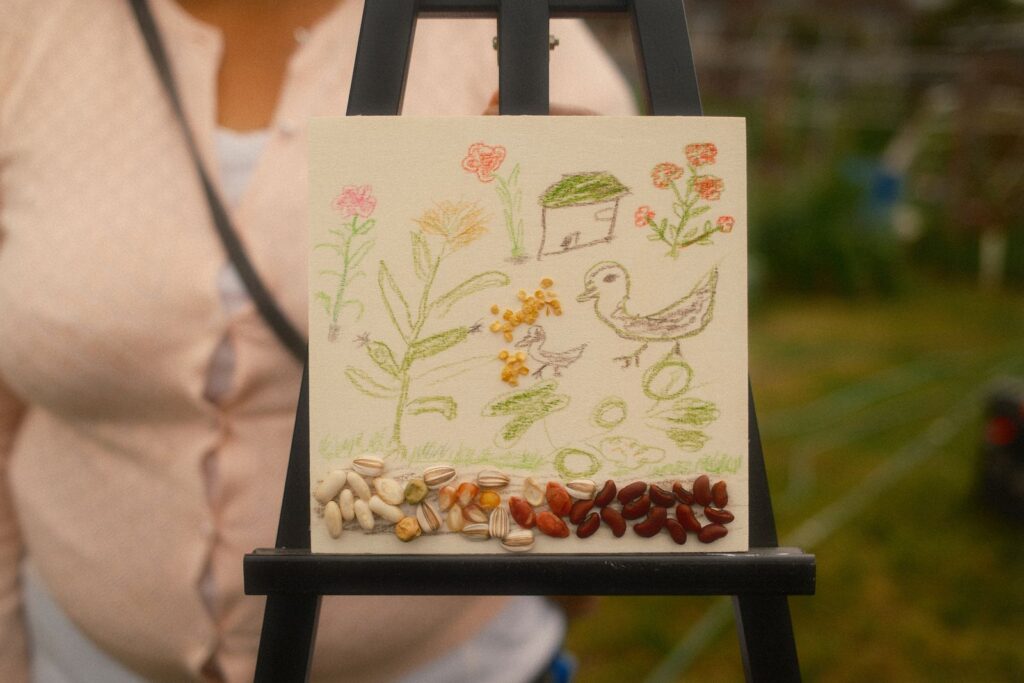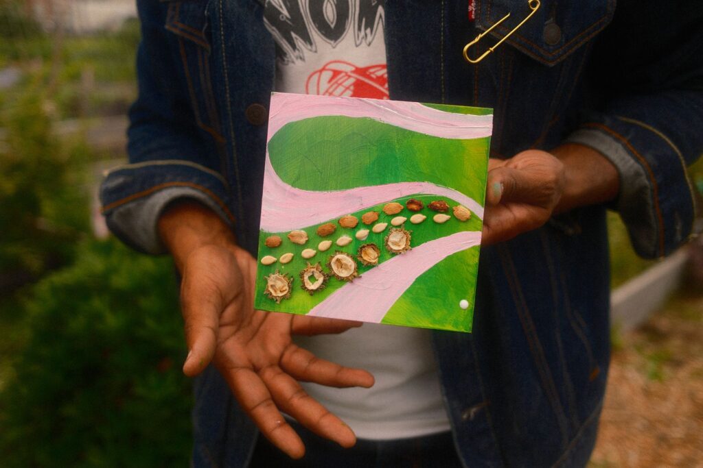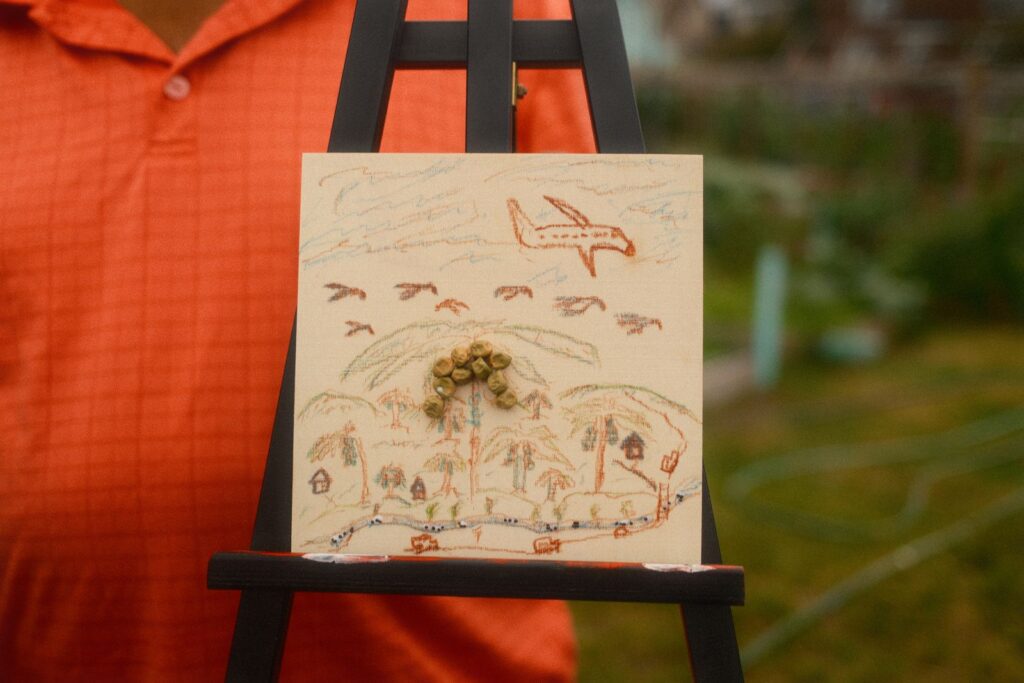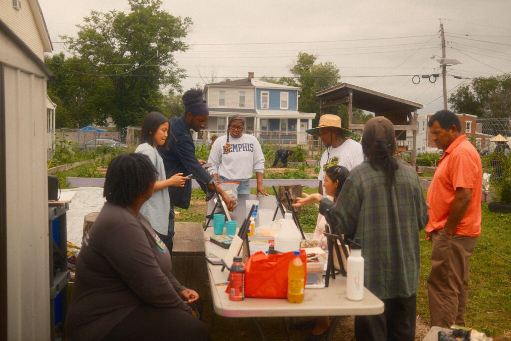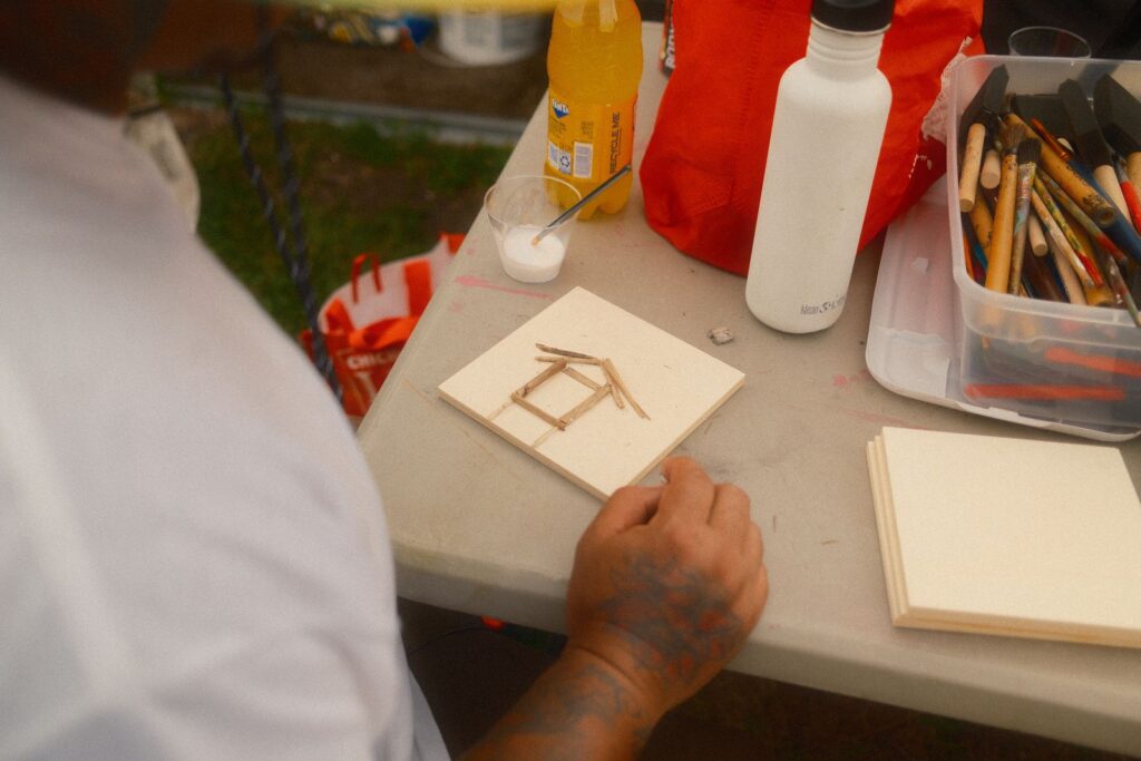 Our first two workshops, which aimed to build relationships and share stories, were a great success. A significant part of my work involves narrative storytelling and taking the time to learn about ourselves, love ourselves, our history, and our future. Besides joining the cohort a little later, one of the challenges I faced was language barriers among community members. I had to adjust my original lesson plan and goal for the community workshops, as everything would be translated into three languages. It pushed me to think about what I wanted to say and how I could make the workshops impactful in the same way I usually do – but without talking as much. After leading a breathing exercise, I provided three brief prompts encouraging community members to simply create. I shared some work examples from my Assistant LoAn and, as a group, we let the art and music take over the garden for the evening.