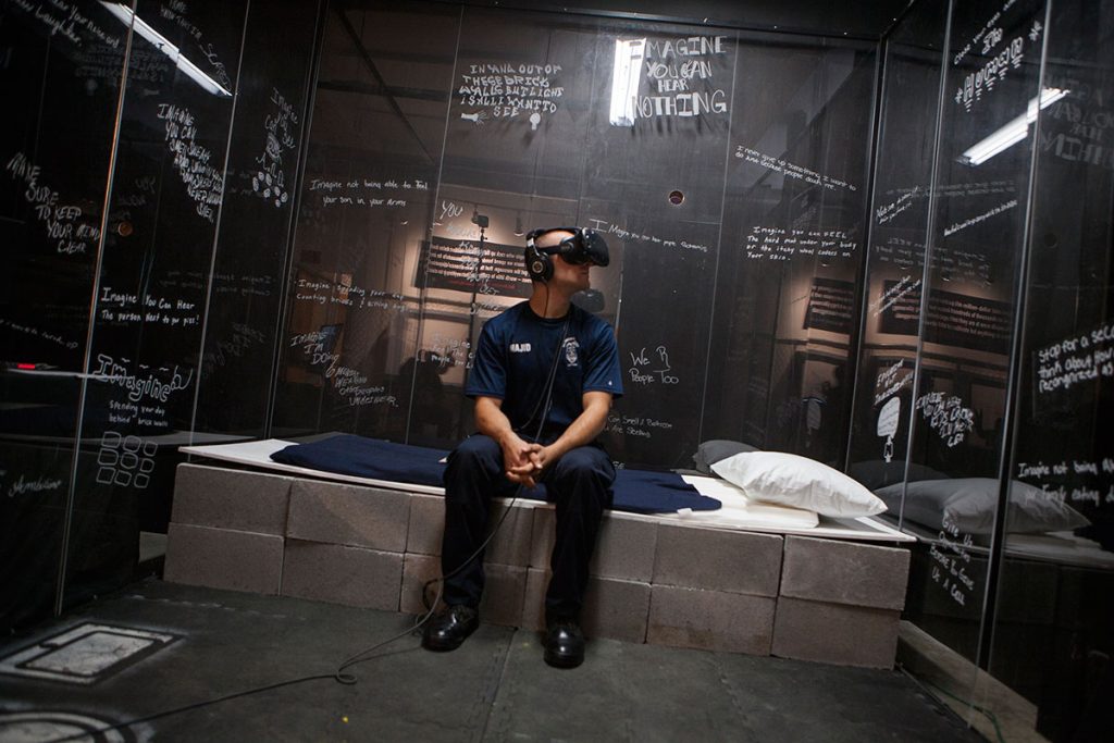 So they’re learning about the legal side of the system, and they’re working with artists and storytellers to think about how they can combine legal knowledge with personal experiences, to reimagine what the juvenile justice system could look like, to imagine a world without the school-to-prison pipeline. We’ve traveled all over the state and hundreds of thousands of people have seen the teens’ work, but they’ve also created their own police training manuals and an immersive training experience, which Mike has been part of. It’s being rolled out now to train every single police officer in the city of Richmond. The teens made a virtual reality film that is getting put into a headset that every single police officer in this city is going to have to put on, as well as seeing all the other artwork that the teens have made. That will then become a classroom space for Mike and others to take those police officers on a deeper dive into youth development, trauma, reimagining and identifying the police’s role within the school-to-prison pipeline, and working with them to propose solutions.