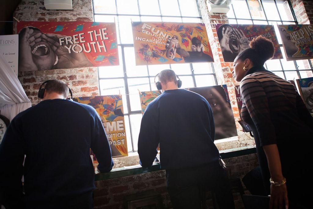 Mark: For us, we not only see youth as experts in the best position to reimagine the system, but we also see all of us as actors along the school-to-prison pipeline. So we find ways that our exhibits can be, rather than passive viewing experiences for people to pat themselves on the back, acknowledgement that we can all be positive or negative parts of the system. As an artist, my responsibility is to ensure that these stories connect with the right people. We do that with the police trainings, with the parade where the art gets marched down Richmond’s main streets, creating mobile exhibits to enter classrooms and museums, just trying to do the stories justice. Of course when you’re asking teens what they need to stay free: jobs. And many other things like mental health support, housing, family reunification, but these are all basic needs. We designed a fellowship that connects youth in our program with creative jobs that they identify. So one of the teens in our program is co-teaching a college class now—shifting that pipeline, going from a juvenile prison into a college classroom where they’re looked to as a leader, somebody with a lot to share, not as the worst of society, as the system tries to paint them.