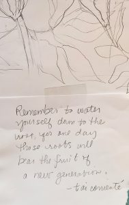 “I was inspired by a quote I wrote based on the theme,” Tai Corrienté told me. “‘Remember to water yourself down to the root, for one day you will bear the fruit of a new generation.’ I just started thinking about painting a motherly figure that is giving life to a younger girl. And you can see that she’s coming into her own; she’s growing with the help of being nourished by that mother.”
