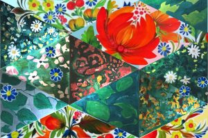 Porch Light staff, Nadia Malik and Mat Tomezsko, hosted the artists at the Color Me Back studio for a collaborative painting activity that adopted the Petrykivka style from the designs produced during the previous online sessions. Mat Tomezsko and the Color Me Back program coordinated a composition that brings together the materials and original designs produced entirely by the Ukrainian artists throughout multiple sessions over the last year. The piece is 72”H x 144”W, painted on mural cloth and mounted on Dibond panels.