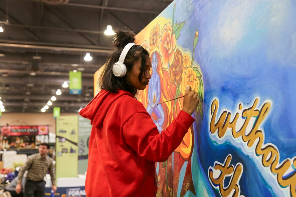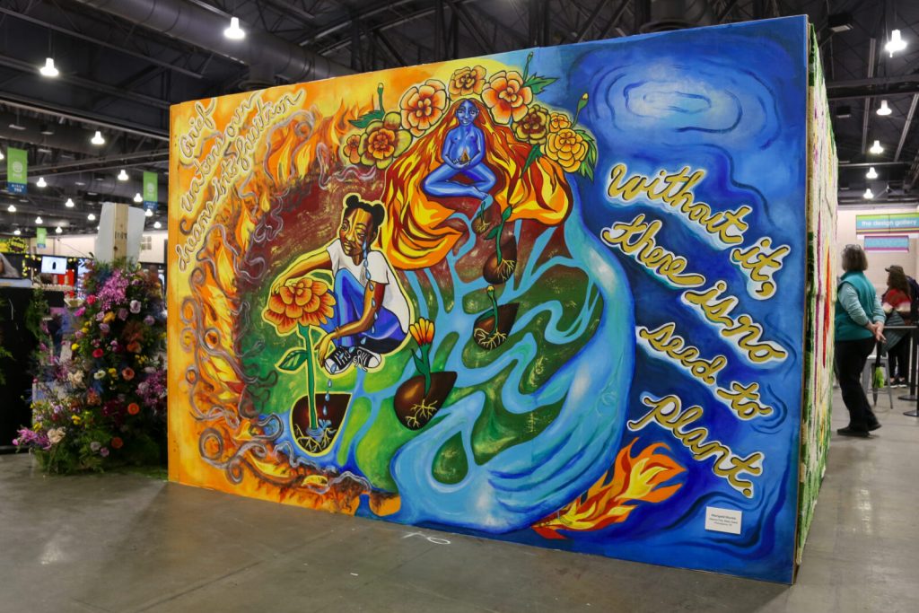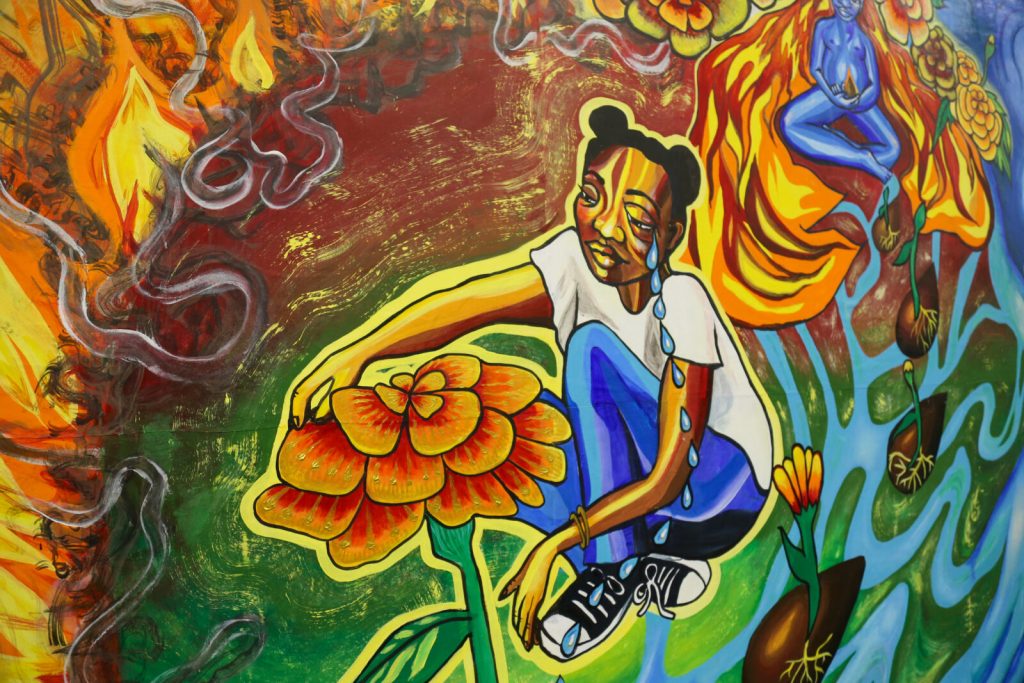 Artist Statement: Mama Fire, Baby Seed displays the inevitability and necessity of destruction within creation, drawing on the renewal of self as a liberatory practice. In this mural, a mother plants a seed inside of herself as she comes home to her body, land, and spirit. The mother holds the legacy of her ancestors inside her, and she continues the renewal of life as she becomes fire. Birthed through the dismantling of their mother’s world, a baby seed emerges from the fire and transforms into the beginning stages of a marigold. Grief waters our dreams to fruition; without it, there is no seed to plant. In this image, we honor the cycle of the deconstruction of worlds bringing us into new ones. The Marigold Child is the creation of a revolution: a liberatory force continuing the freeing of the colonized bodies and lands. Planted in faith, the Marigold Child is one of many seeds of rebirth.